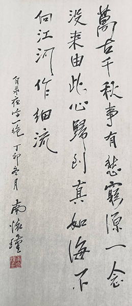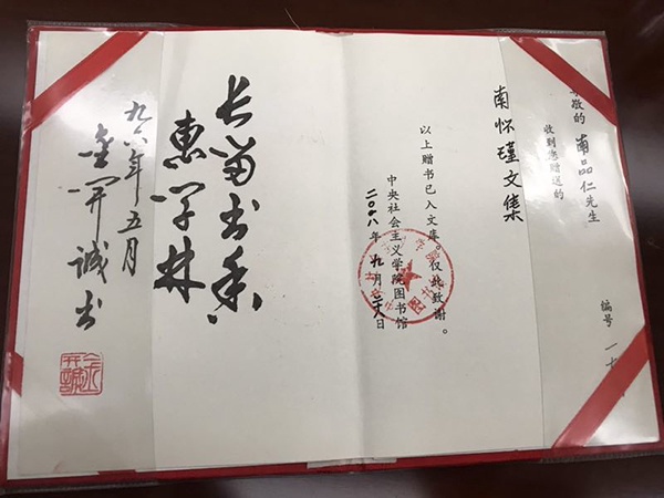 南品仁向中央社院图书馆捐赠的南怀瑾诞辰百年纪念文集,包括《论语别裁》《孟子旁通》《原本大学微言》《老子他说》《列子臆说》《禅海蠡测》等代表作,总计52本。此外,南品仁还捐赠了南怀瑾的诗词书法作品“万古千秋事有愁,穷源一念没来由。此心归到真如海,不向江河作细流。”
